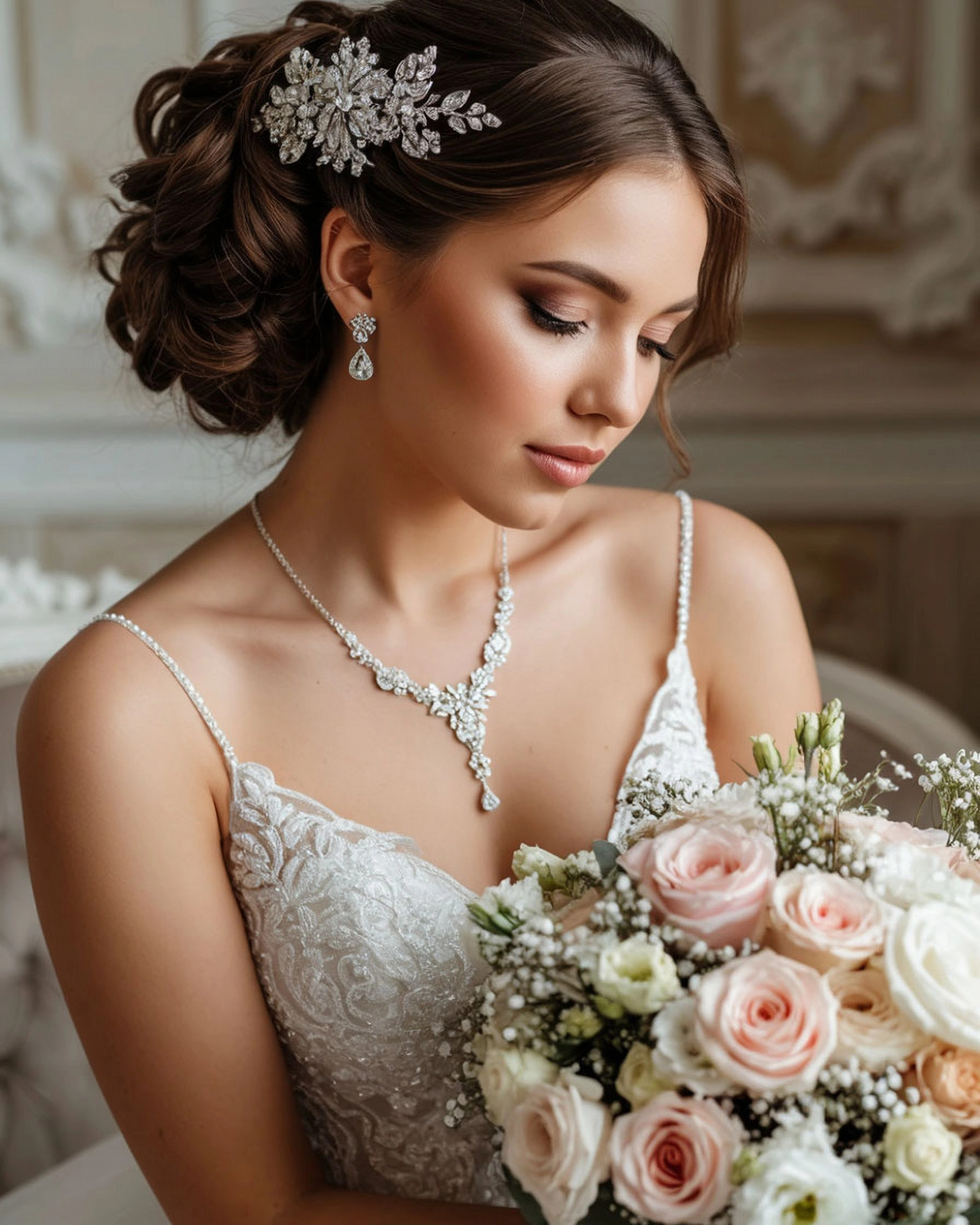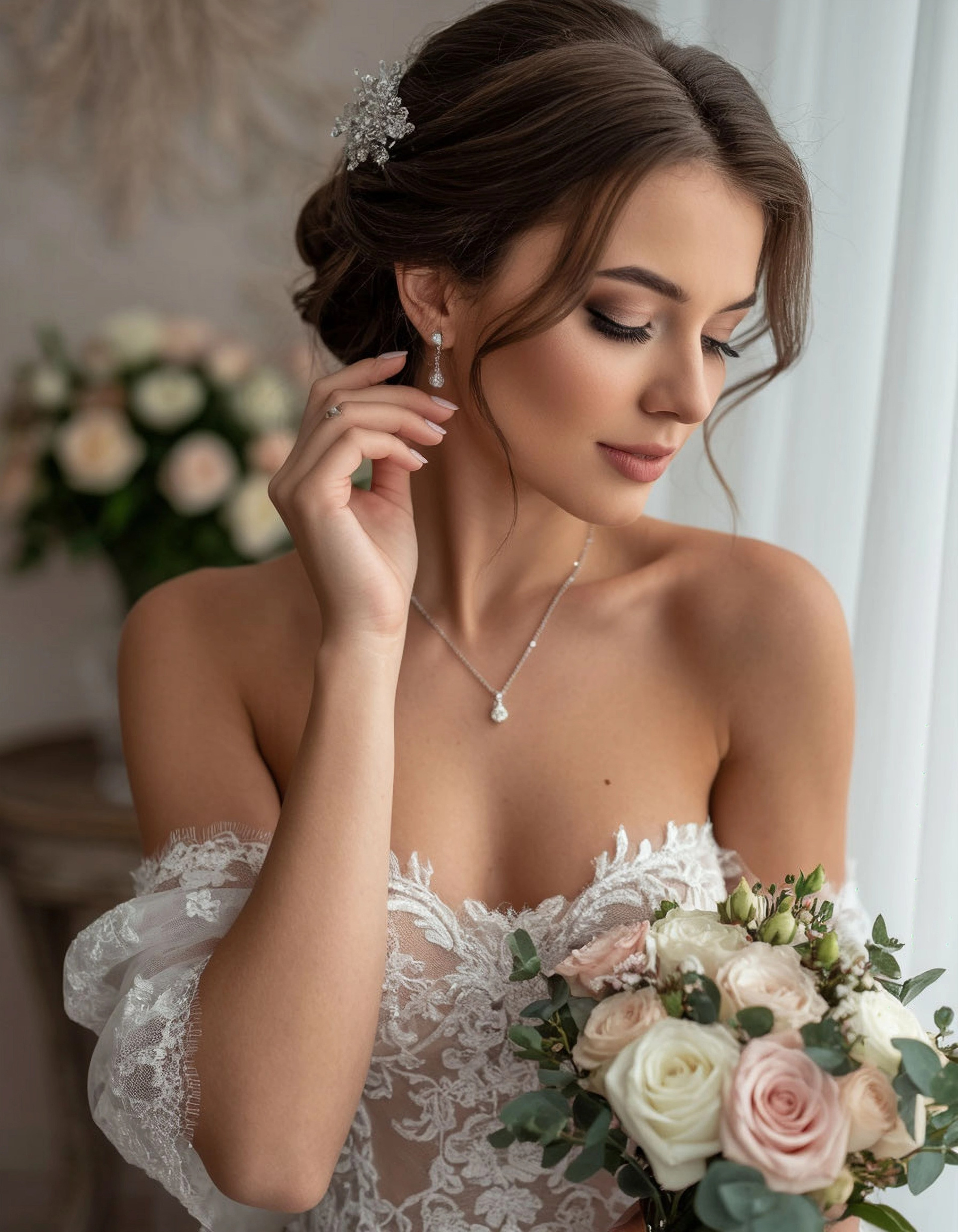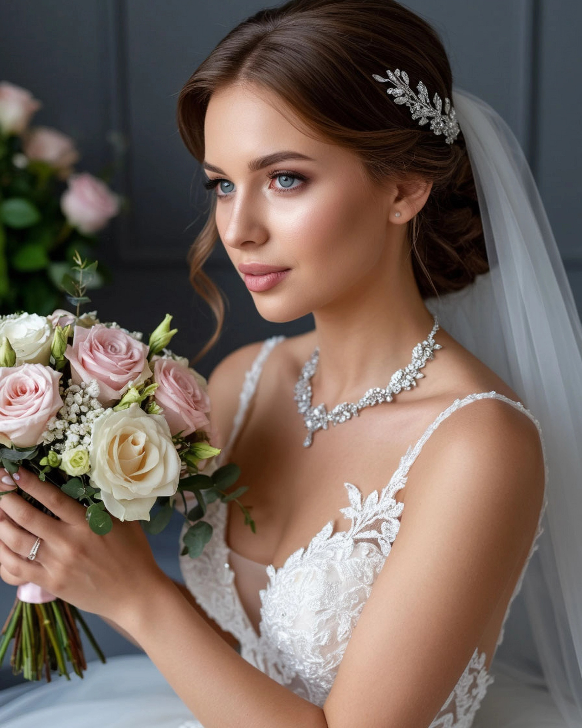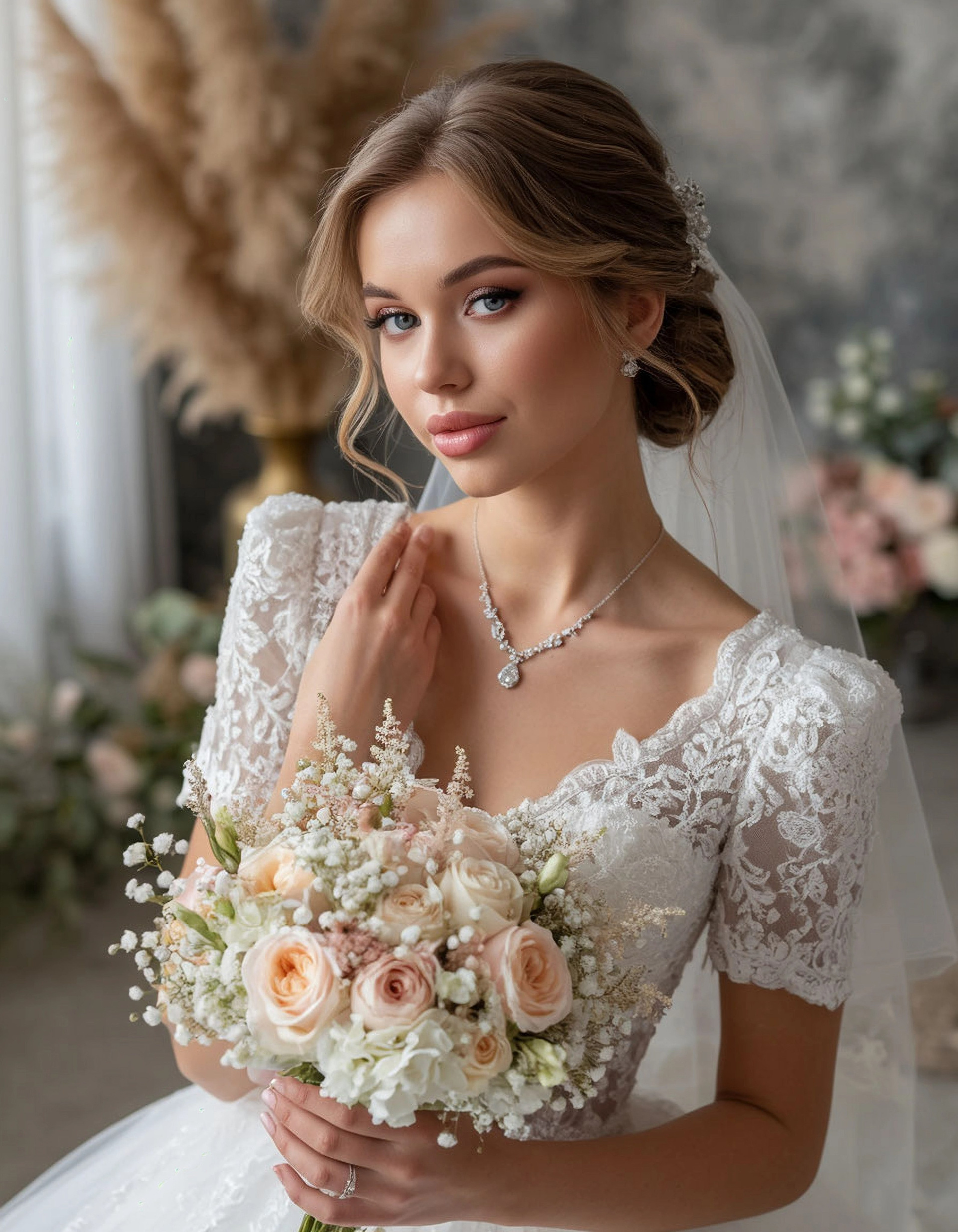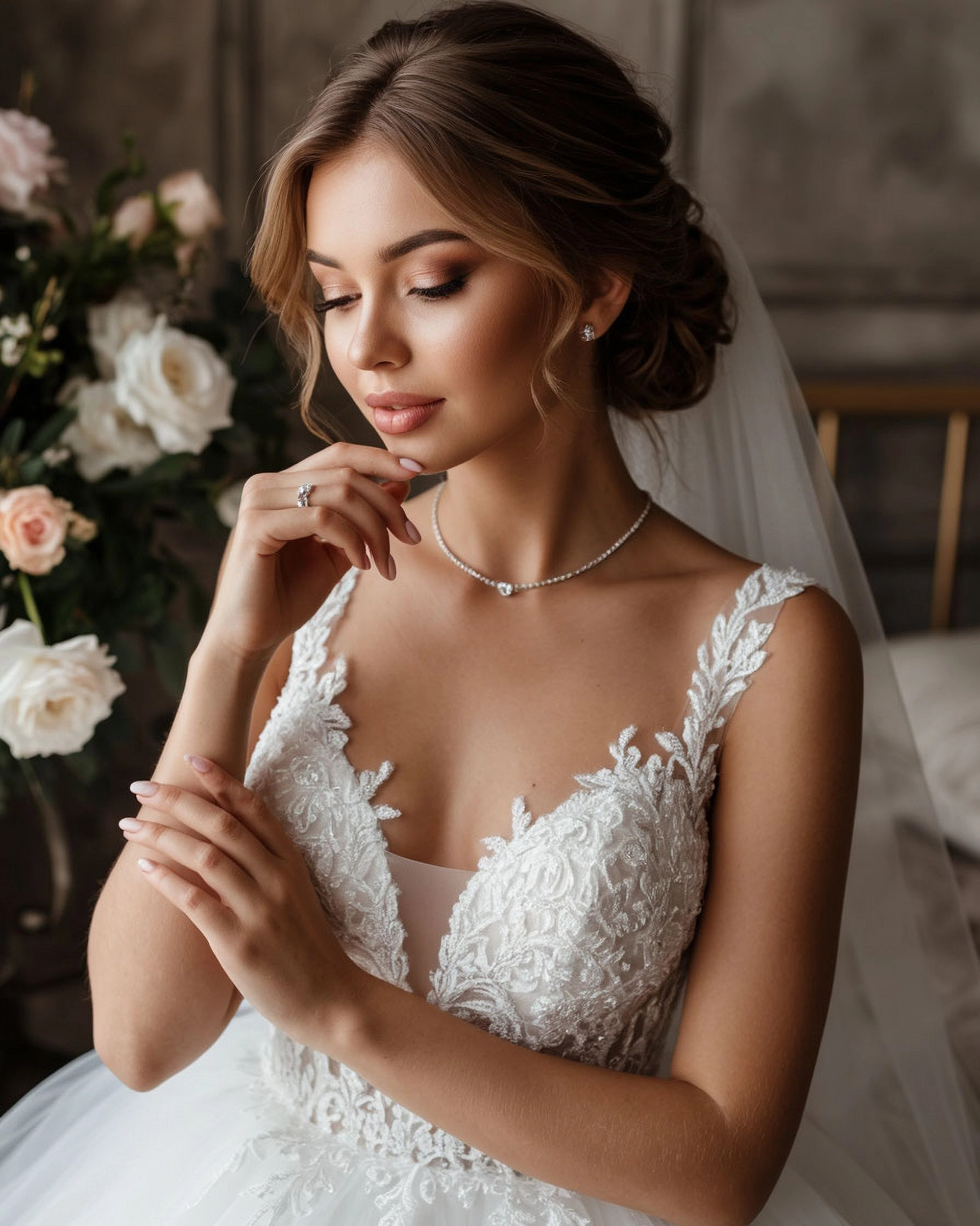 Профессиональное освещение и панорамные окна создают сияние, подчеркивающее каждую деталь: от нежного кружева платья до мерцания украшений. Никаких теней «как дома» — только чистая эстетика. -